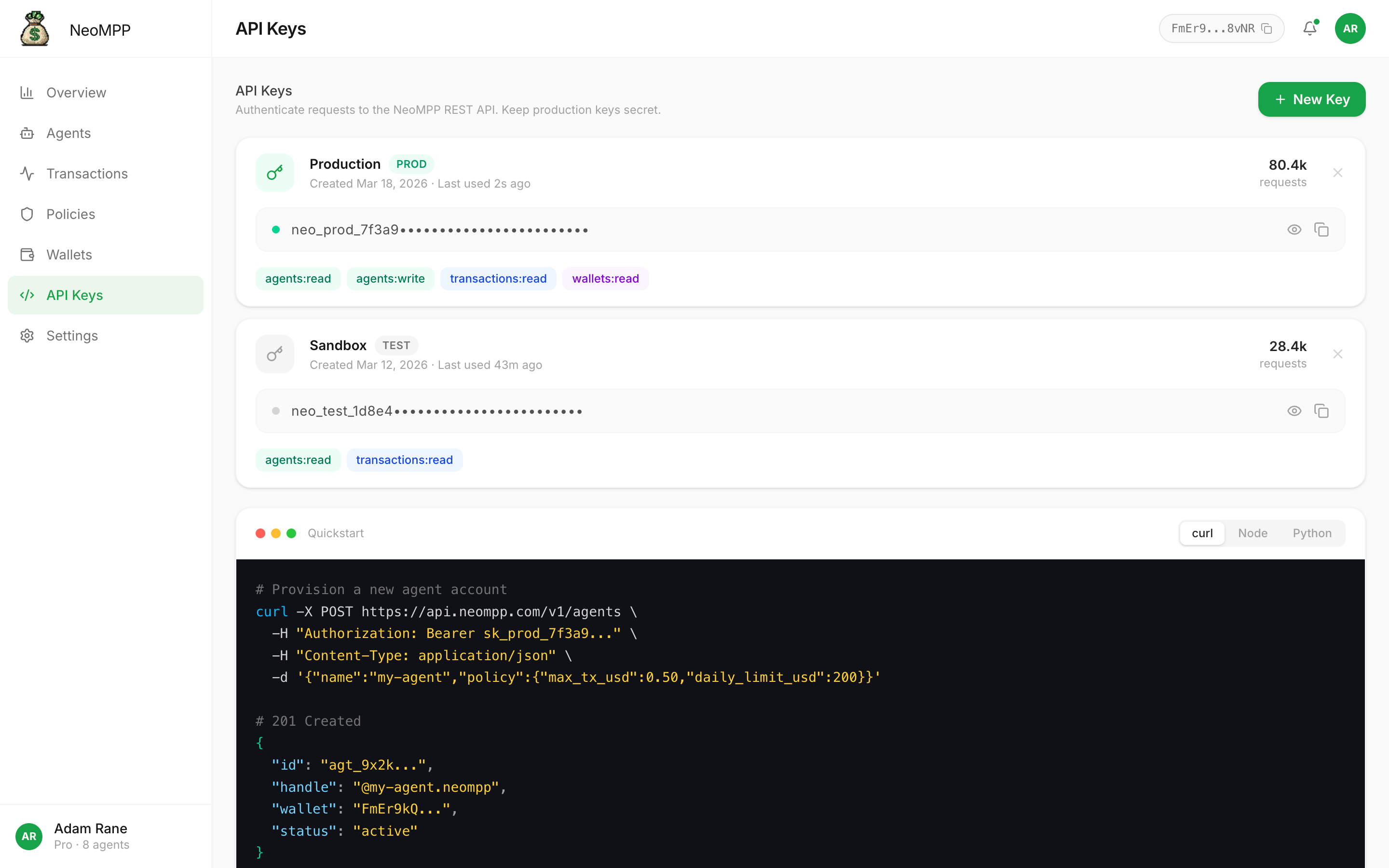 An agent with a NeoMPP account can: pay for services and APIs (inference, data, compute), send money to other agents for completed work, receive payments from the agents or operators that commission it, and manage its own balance within the spending policy set by its operator. All of this happens programmatically - the agent just makes HTTP requests.